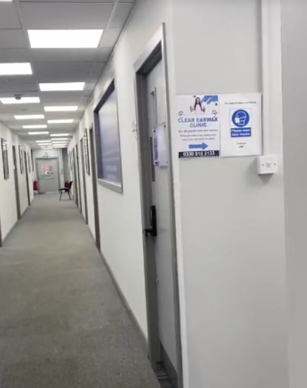 • Go down this corridor on the right and you will see our door with the poster for ‘Clear Earwax’ on it. It is room 101G.